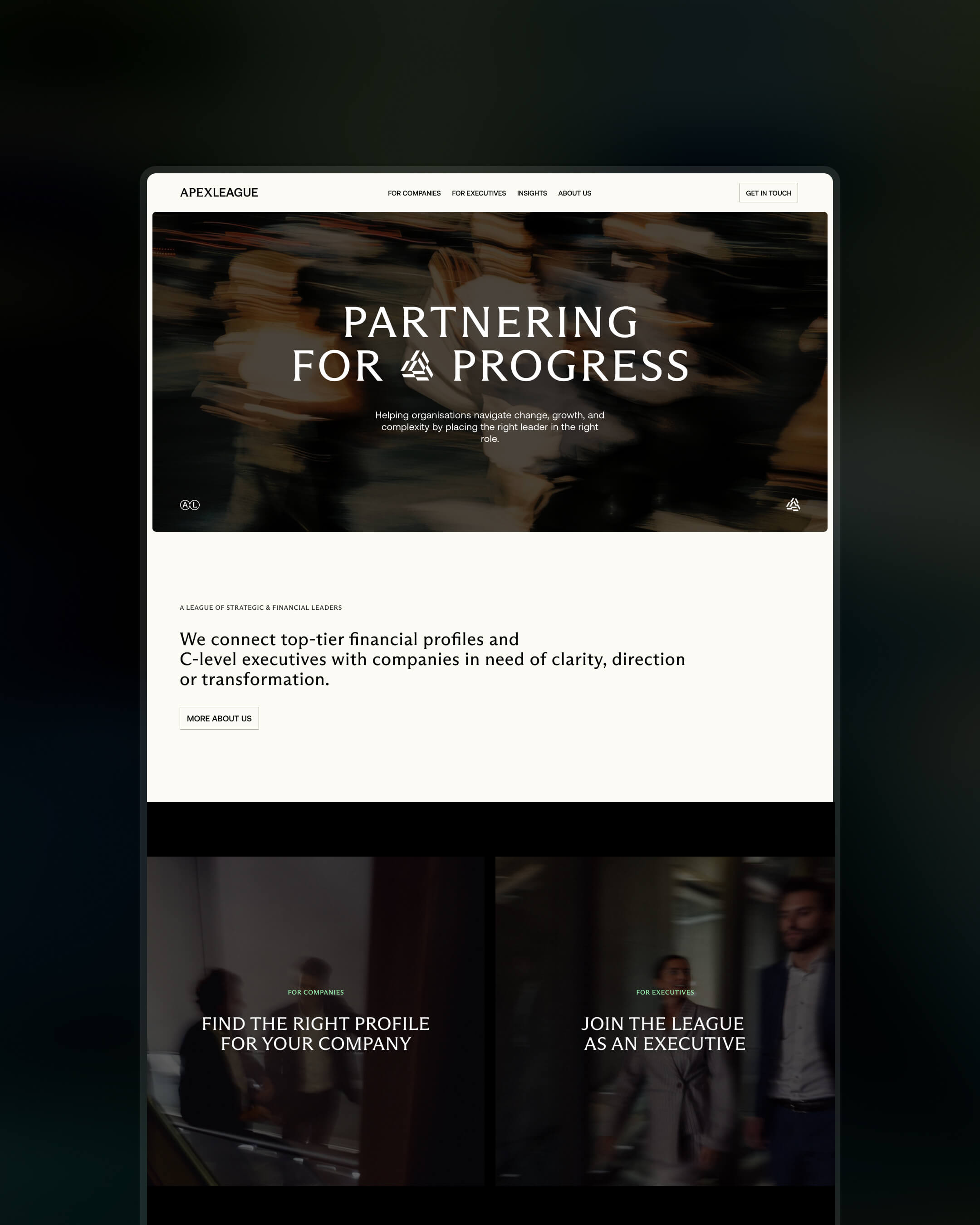 Apex League — Web design for a Belgian financial consulting firm connecting C-level executives with companies navigating growth, transition or complexity. Working from Lucas Vermeire's branding, I translated the premium positioning into a website that feels as deliberate and high-end as the profiles they represent. Clean, confident and precise — matching the tone of the firm itself.
